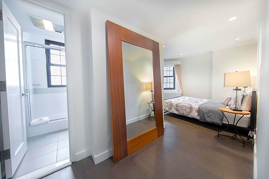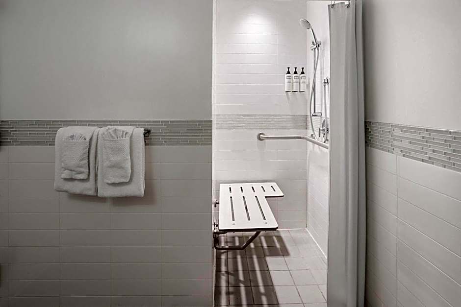 1 Queen Bed Mobility Accessible Studio Apartment Roll-In Shower Non-Smoking is 344 square feet and includes a queen-size bed 150-154 width plus desk and is Wheelchair-accessible.